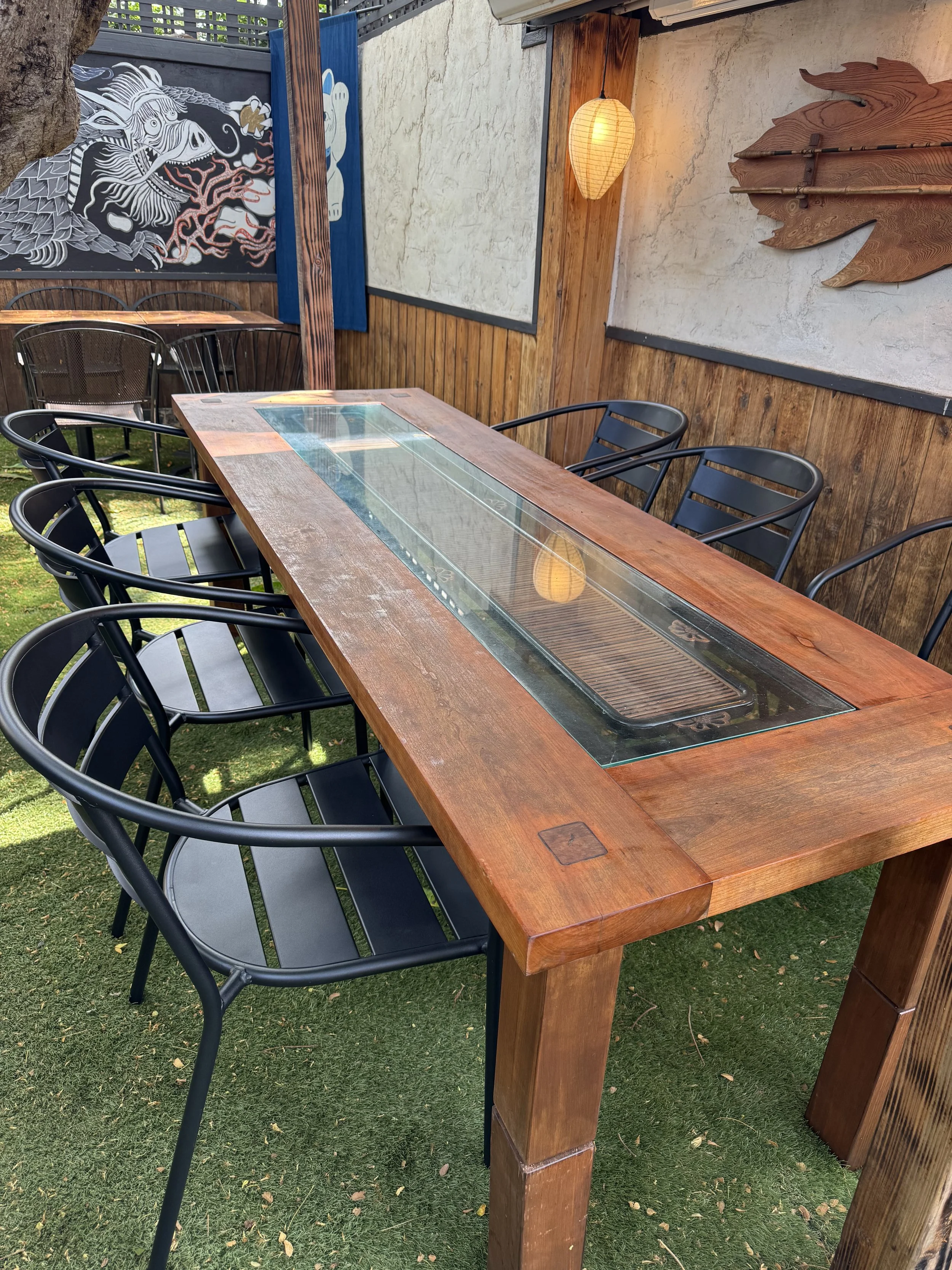 The sushi counter is made out of a 200-year-old, 16 foot long, 6" thick Japanese cherry wood log which had been lying dormant for many years at a mill in Kyoto Prefecture. It is from Mount Daisen, Tottori, Japan.